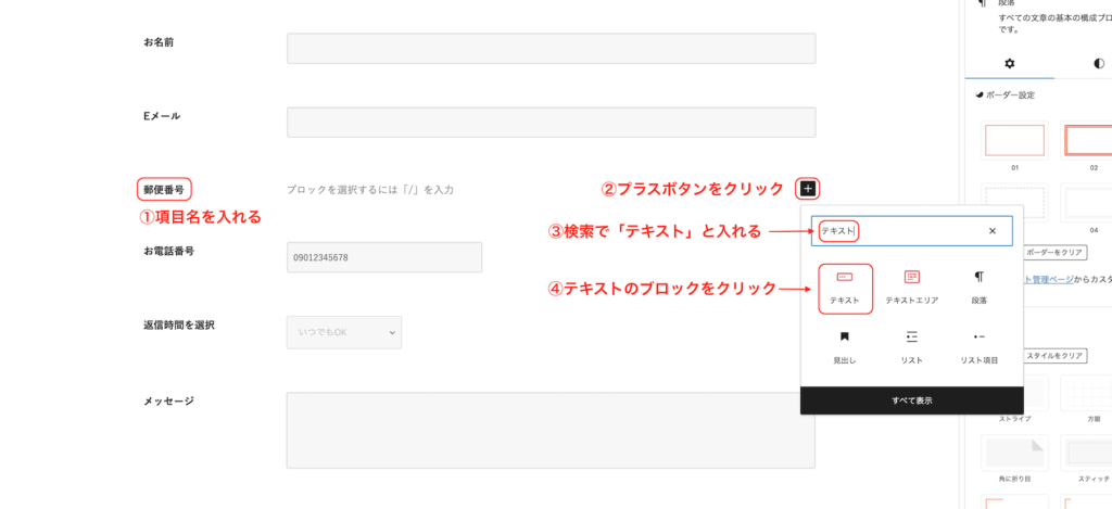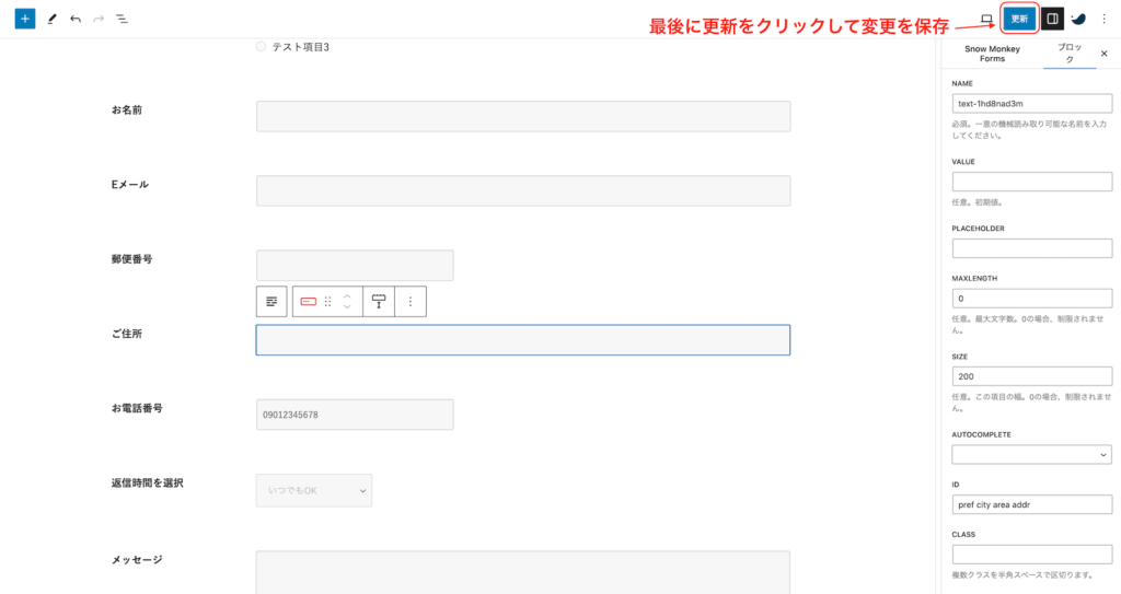 同じ要領で「ご住所」の項目も設置しておきます。郵便番号の下に設置しておきましょう。