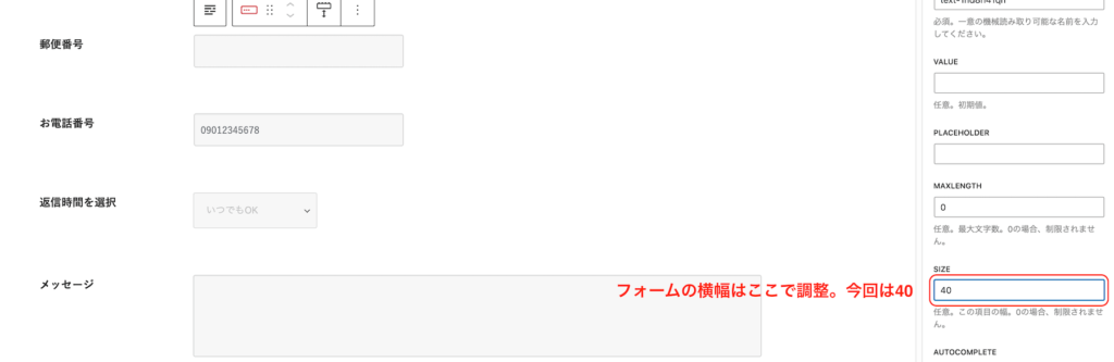 郵便番号のフォームの横幅を左項目のSIZEで調整できます。好きな幅に調整してください。