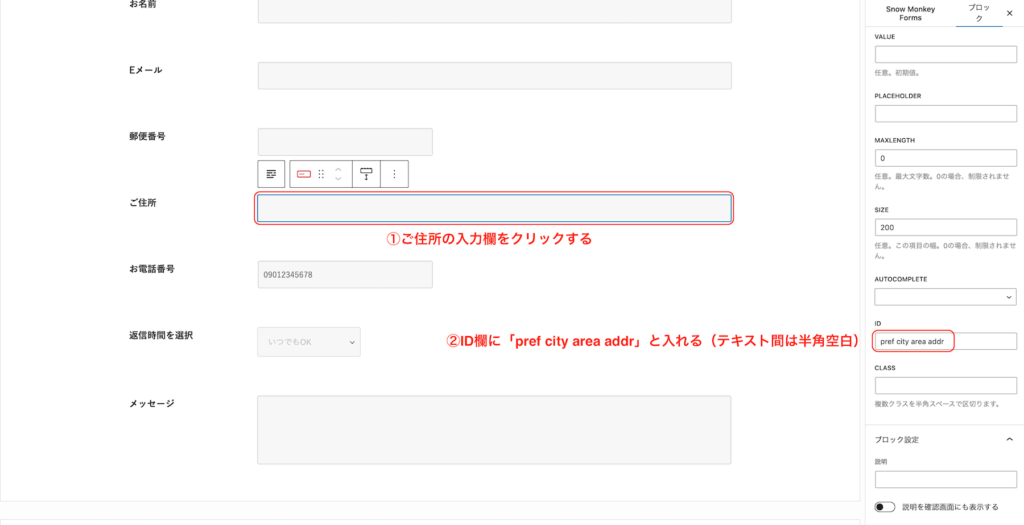ご住所の入力欄」をクリックするとまたご住所の設定画面が右ウィンドウに出てくるので、またIDの項目を探して、そこに「addr」と入力します。